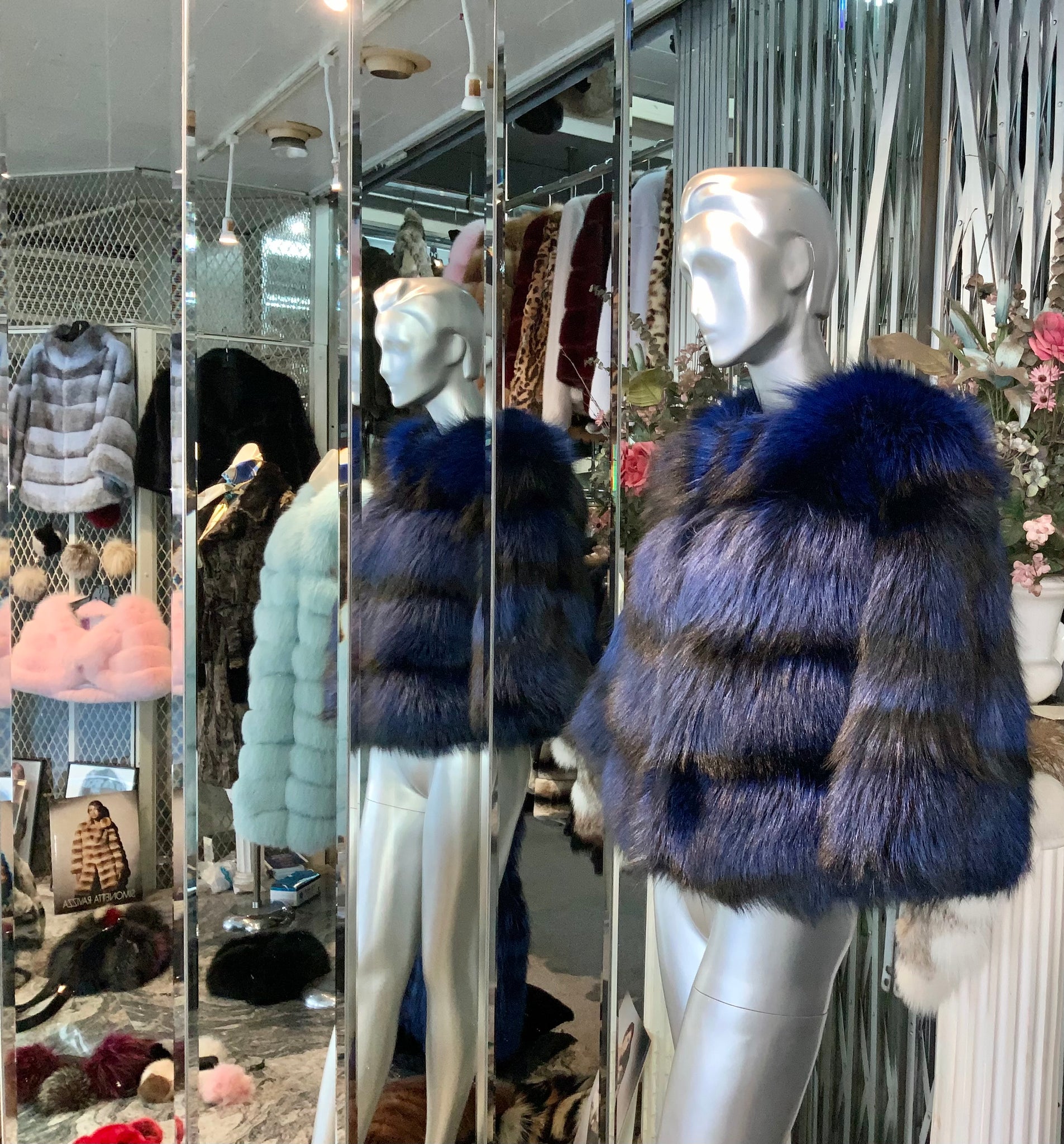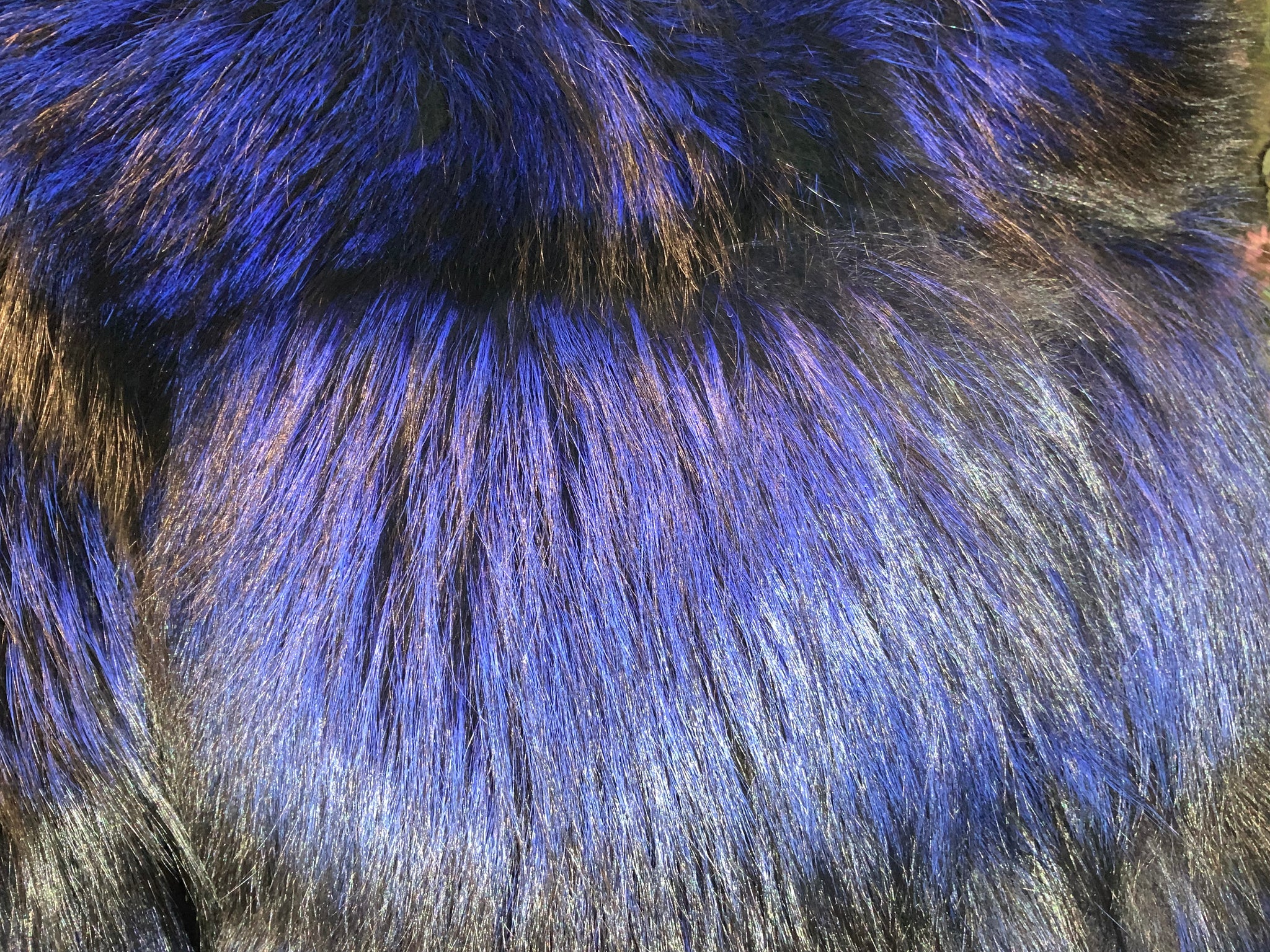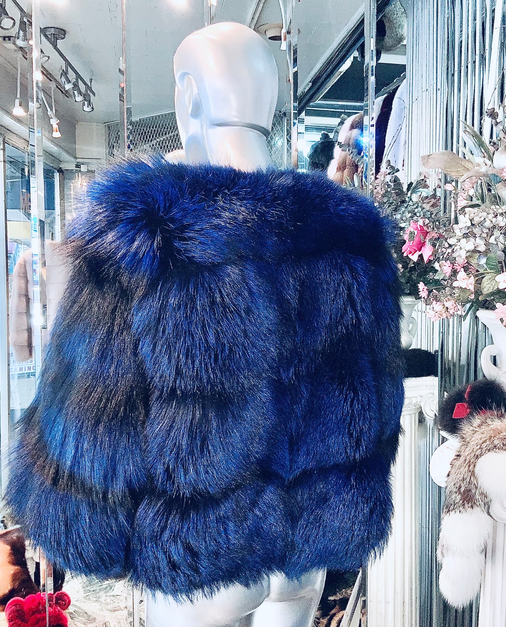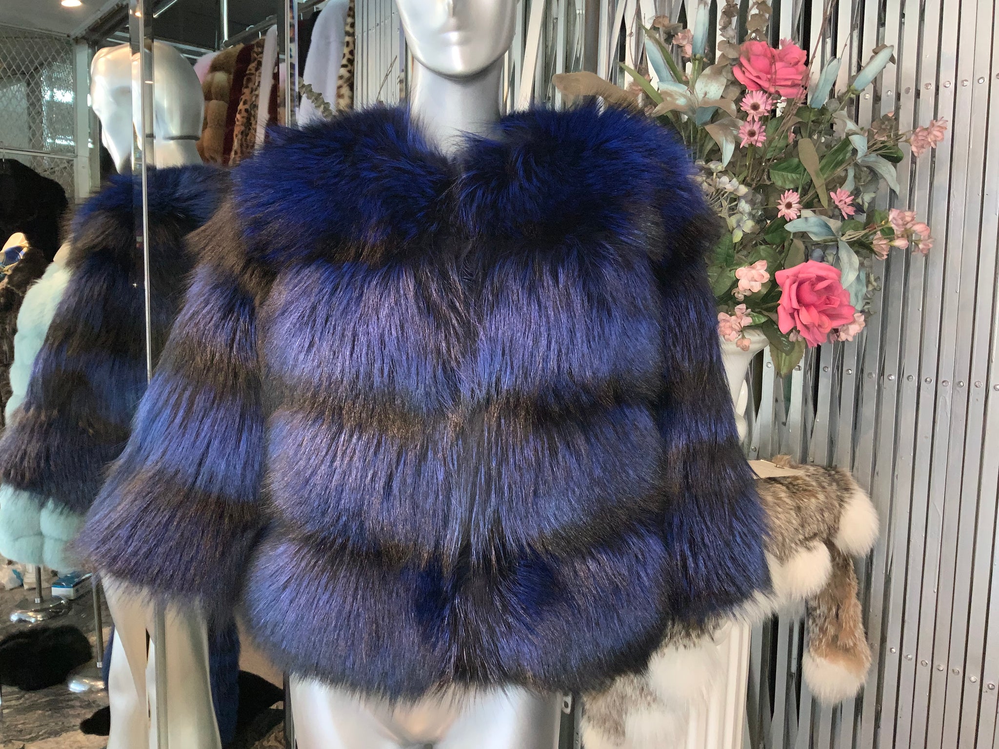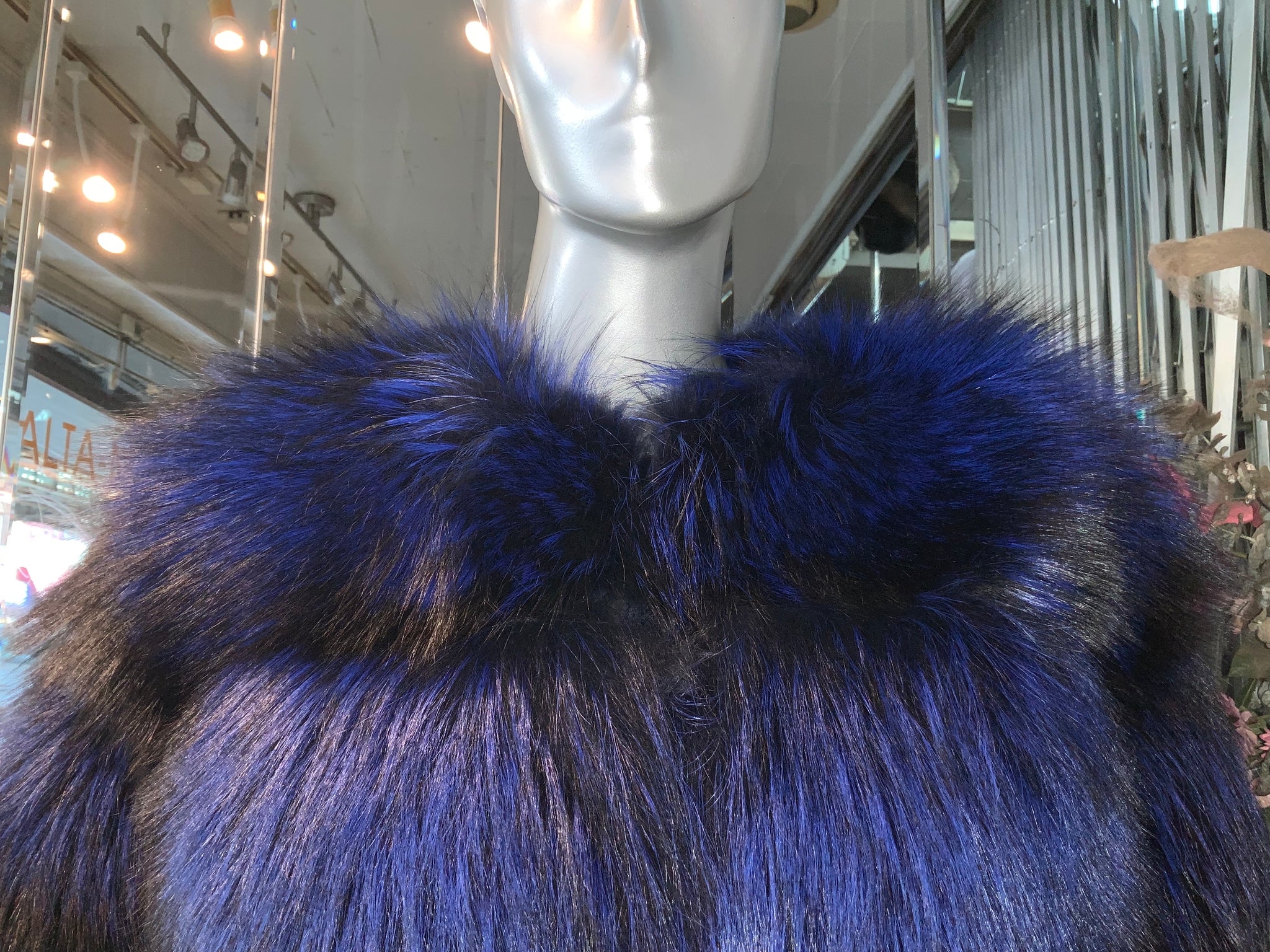 Stunning shade on this fox fur jacket. The color is achieved by dyeing the silver fox fur. This is our royal blue shade.