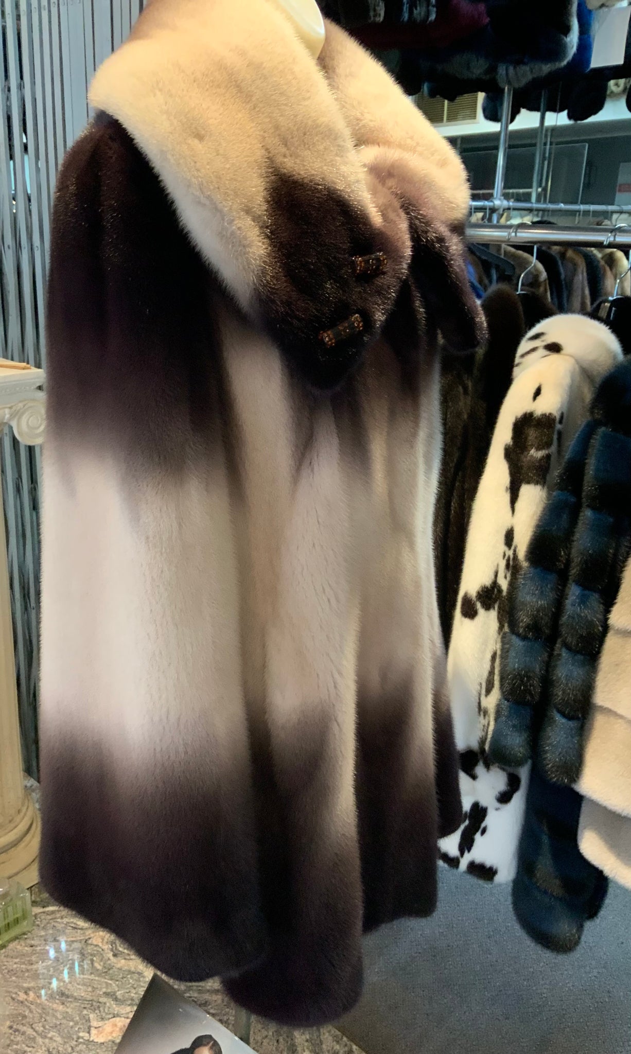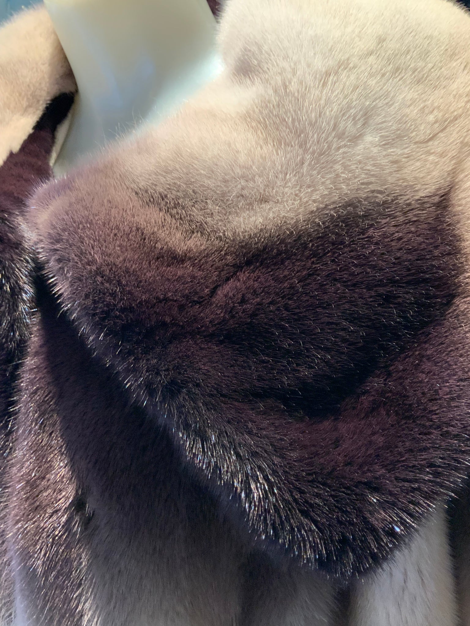 Elevate your outerwear with this exquisite mink fur stroller coat, featuring a stunning plum ombré gradient that transitions beautifully across the fabric. The luxurious mink fur provides exceptional warmth and a silky-soft texture, while the stroller cut offers a flattering, sophisticated silhouette perfect for upscale occasions. The unique color palette sets this piece apart, making it a timeless investment for the discerning wardrobe. Impeccably crafted for those who appreciate fine furs and distinctive style.