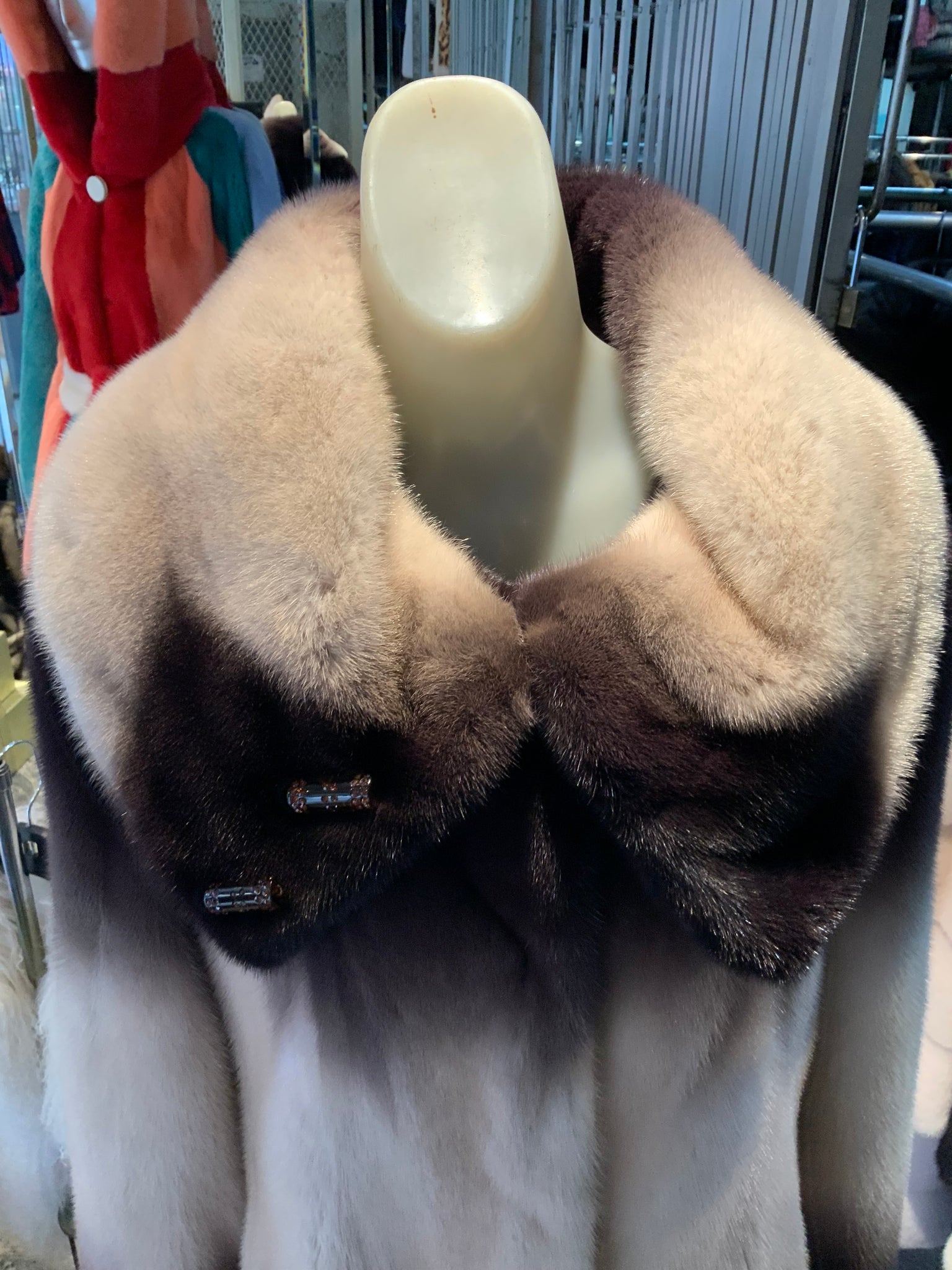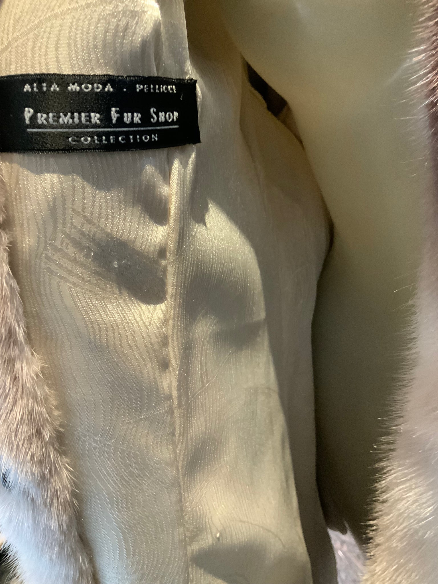 Lovely large wing collar, front metal furrier hooks and rings, side pockets.