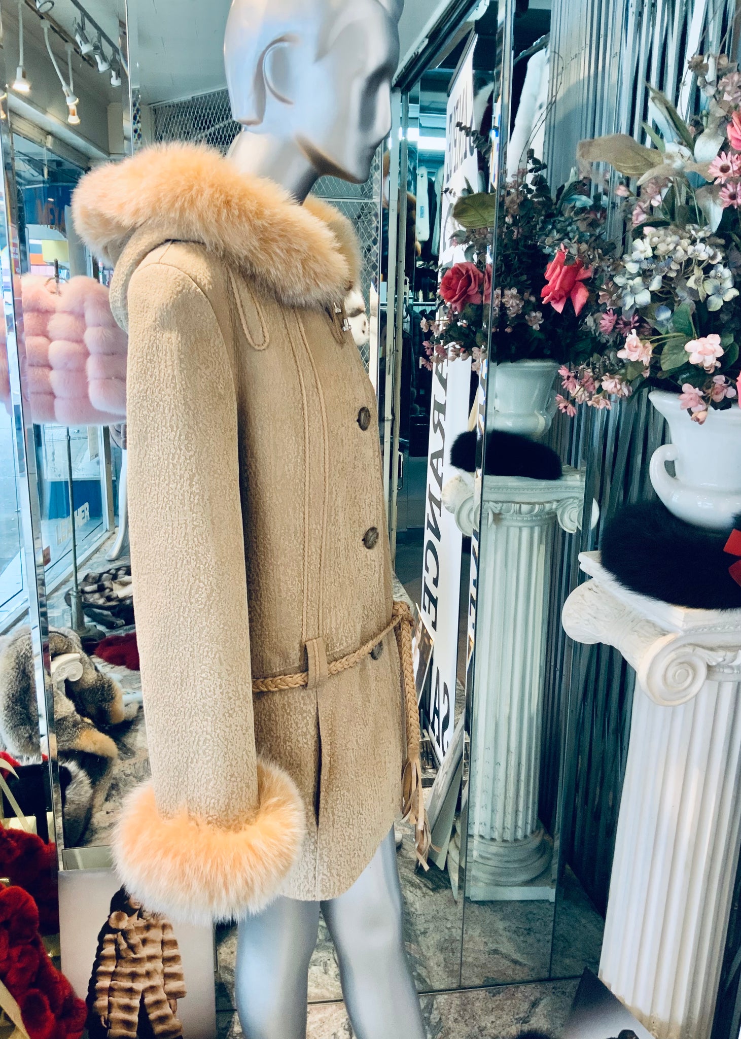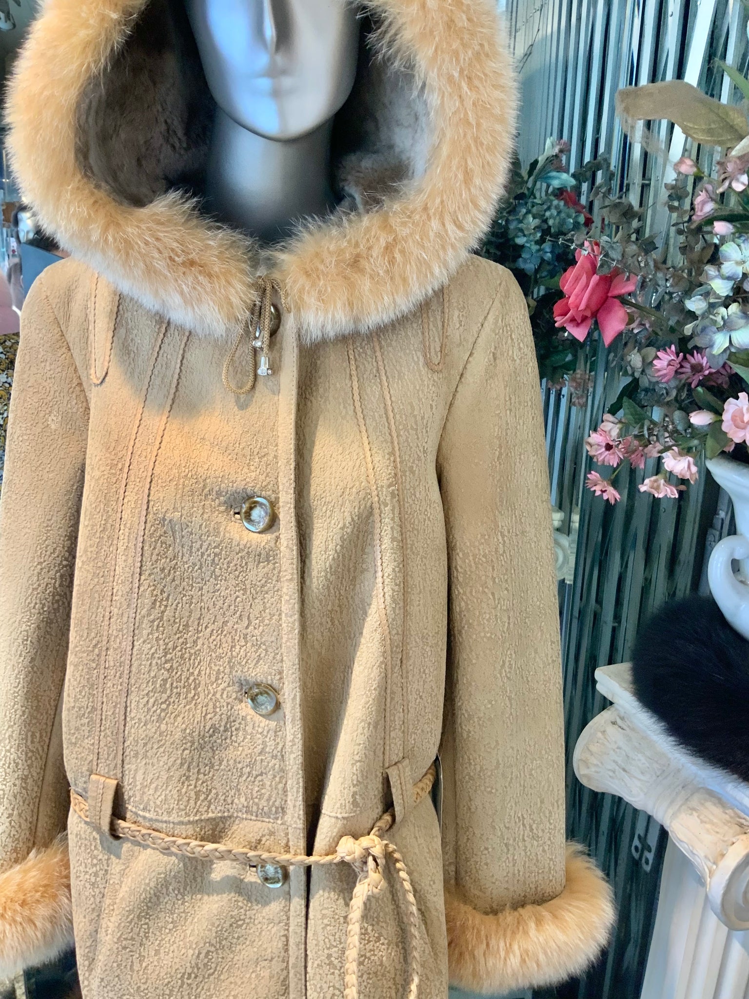 Beautiful shade of champagne beige in this Natural Shearling (sheepskin) fur coat. Lovely style and texture.