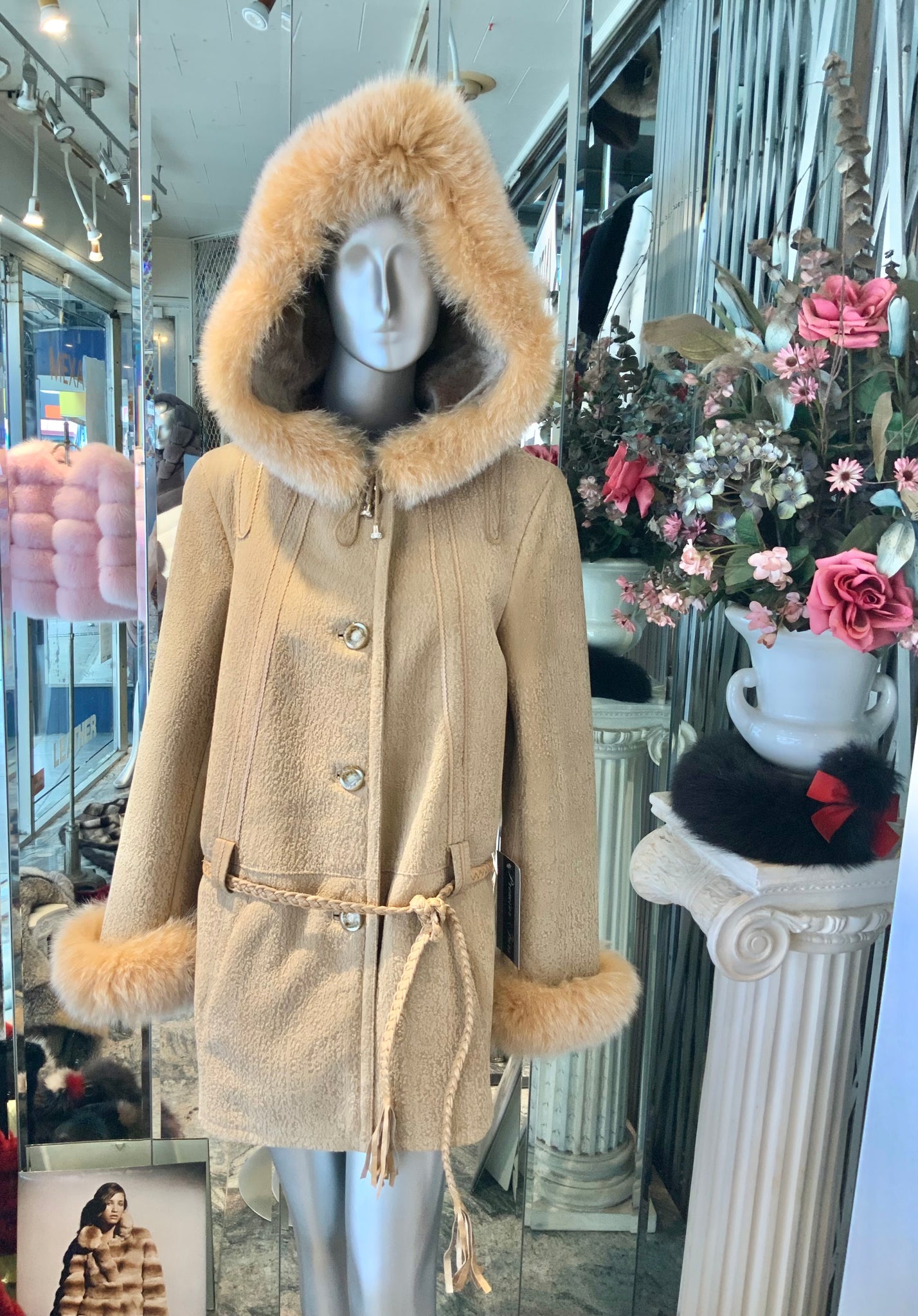Turn back cuffs adjust the sleeve length. The sleeves are adorned with the same fox fur as is on the hood.