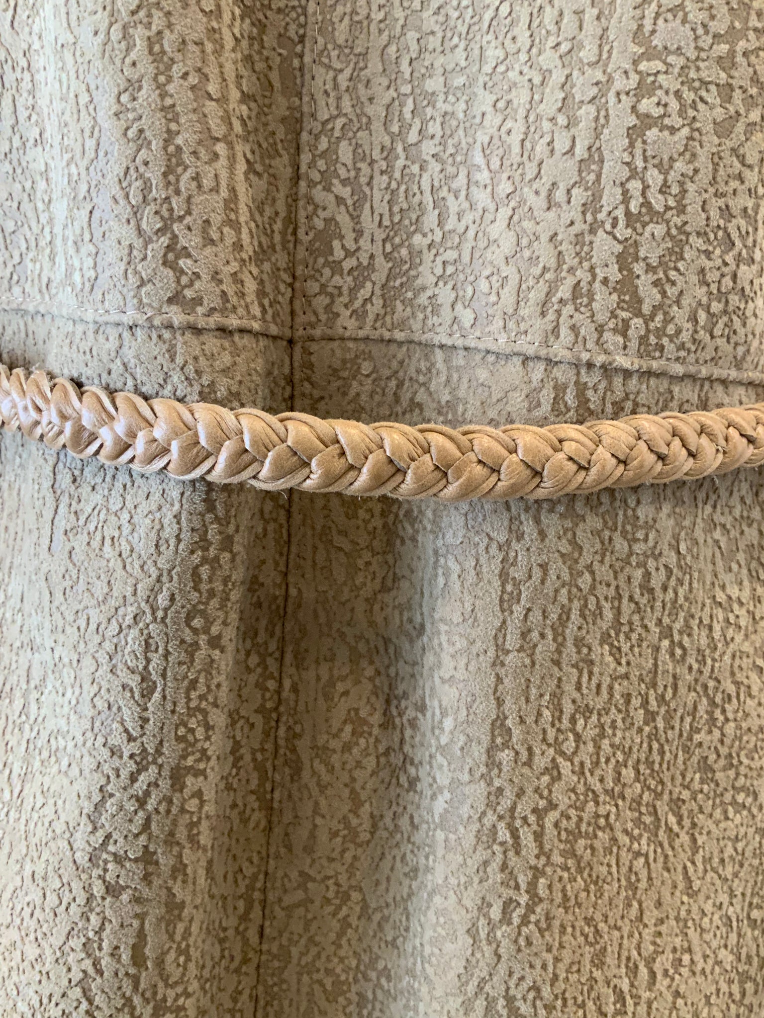 Nice seamwork. Leather braided belt that has belt holders right by the hip, a little lower than the waist—nice unique detail.