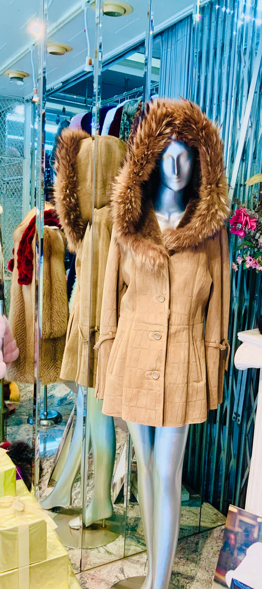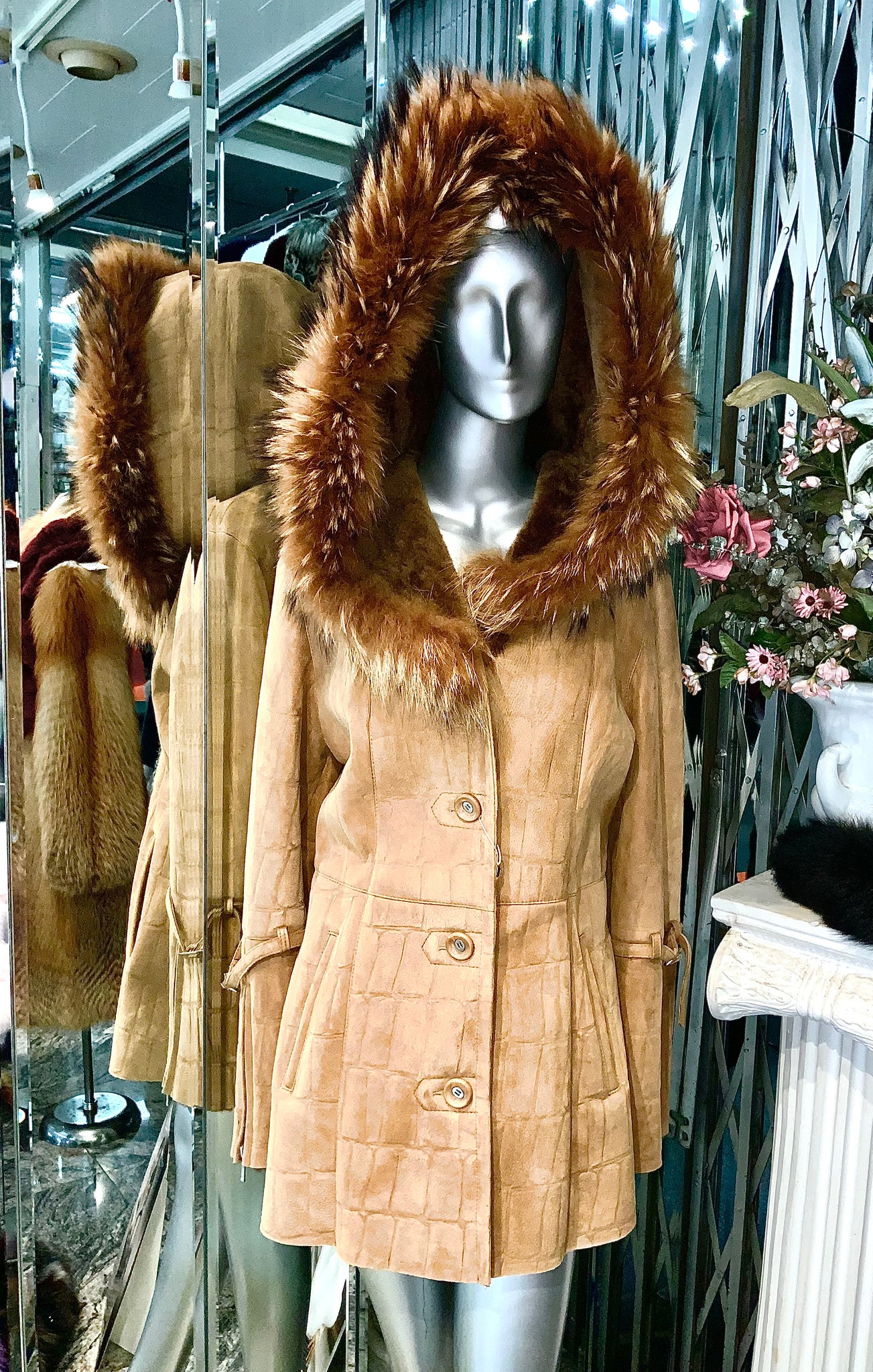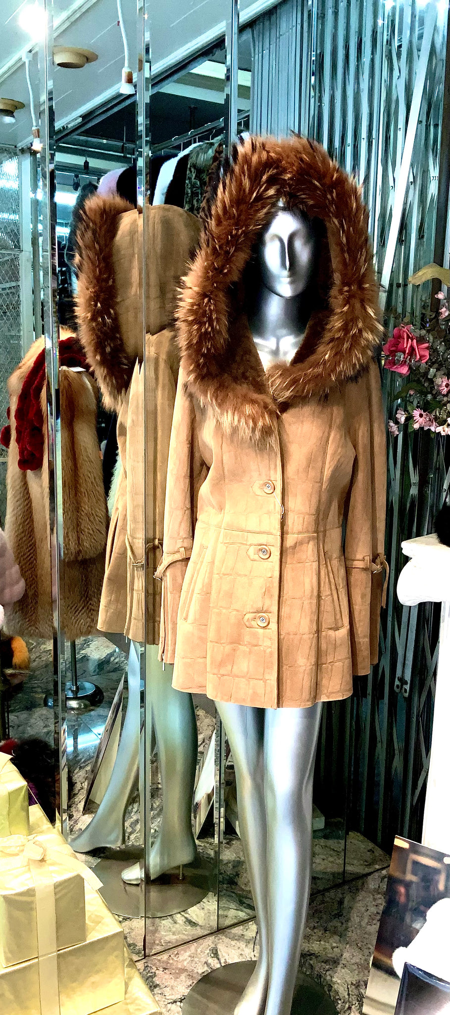 The large hood is downed with Tanuki fur. Exceptional shadings of the fur with darker guard hair tips and lighter tips combination.