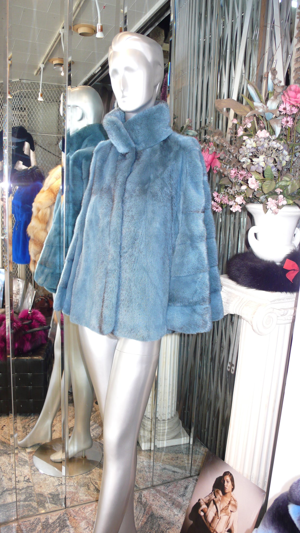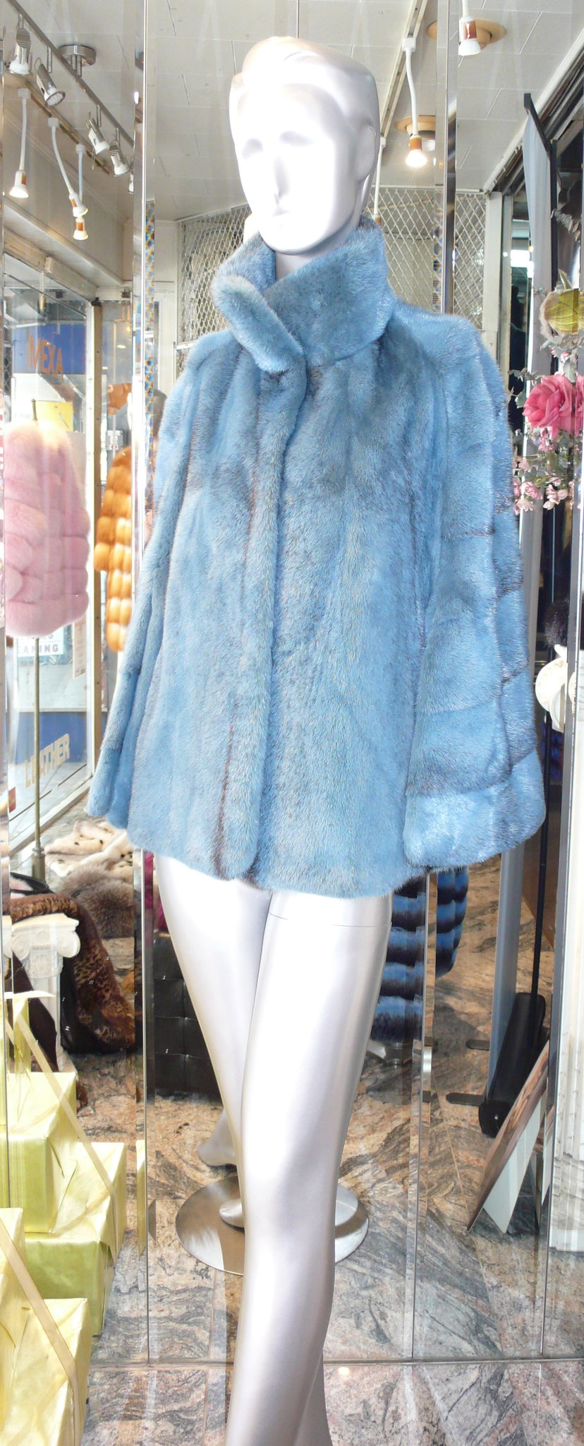 Stunning Mink Fur cape in dyed Teal Blue Shade with subtle black hues. Lovely youthful design. Superior workmanship and style. Fur Origin: Denmark, Saga Select Mink Fur. Horizontal design back, straight front with slightly rounded hemline. Garment length: 23", size: 42 has 12" slits for arms to go through. Side pockets, Stand up Collar with hidden magnet enclosure. Front furrier hooks and rings. Warm, light in weight with superior short nap guard hairs.